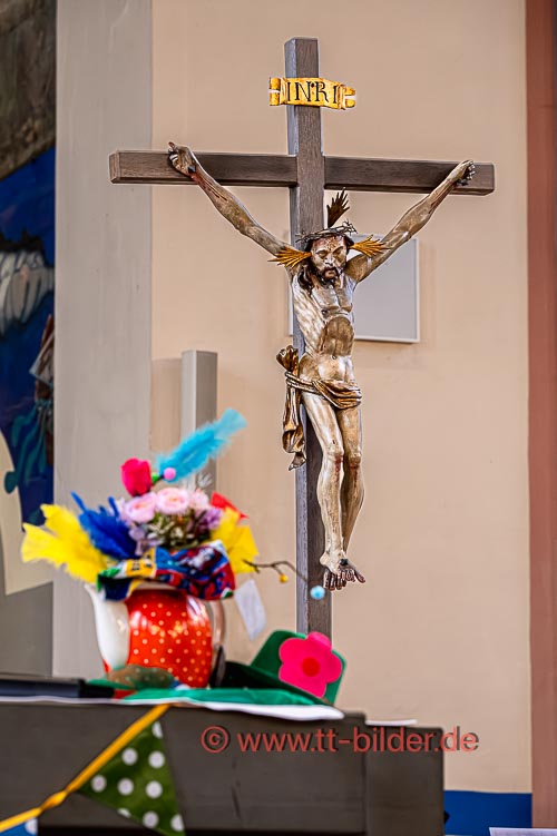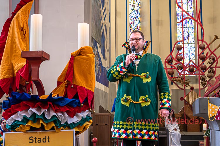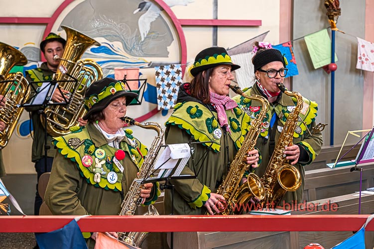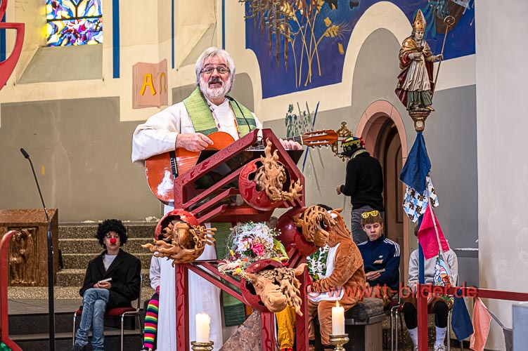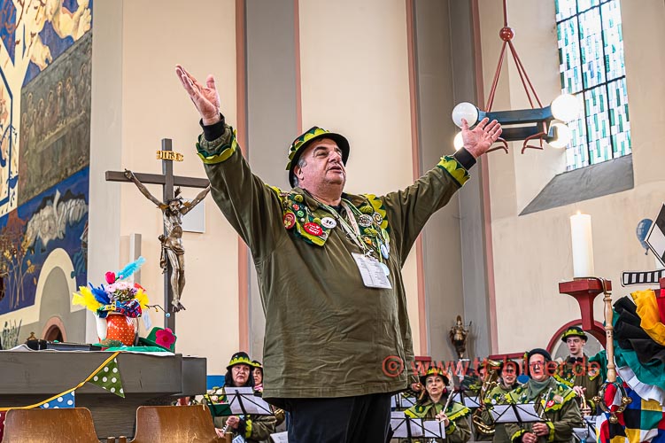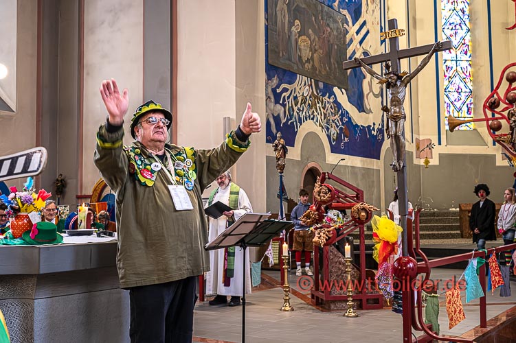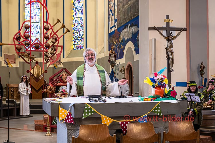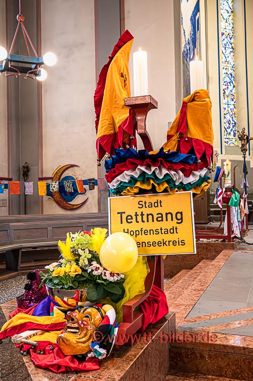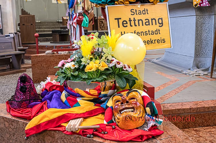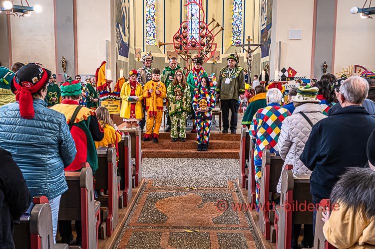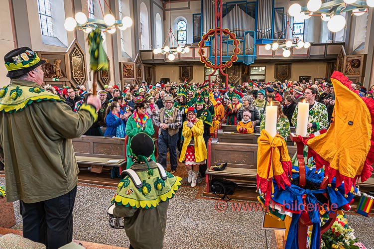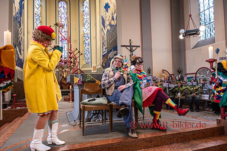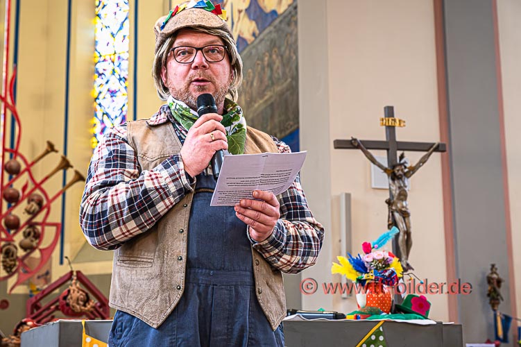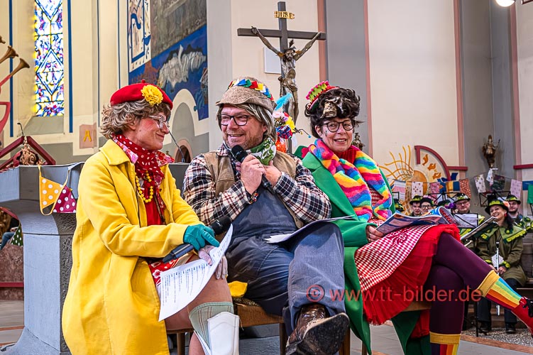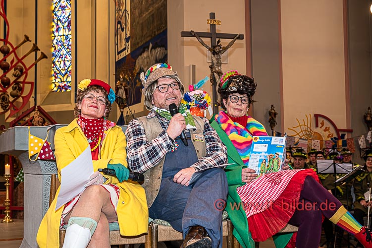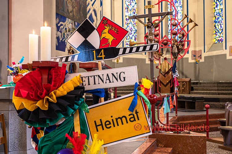 Der Sonntagmorgen gehört traditionell der Narrenmesse in St. Gallus. Ein liebevoll närrisch geschmückter Altarraum bot den richtigen Rahmen für eine stimmungsvolle Narrenmesse – diesmal mit dem Motto Heimat über das Gundel, Bernd und Meggi philosophierten.