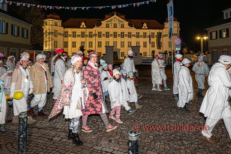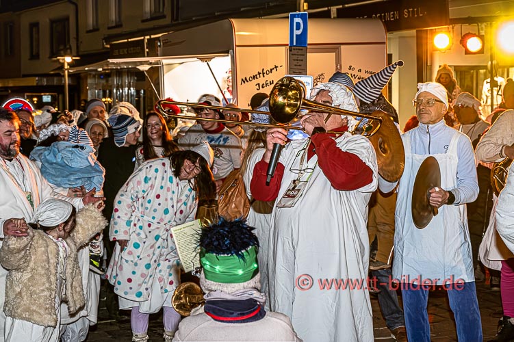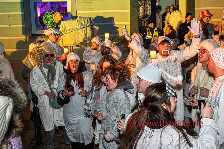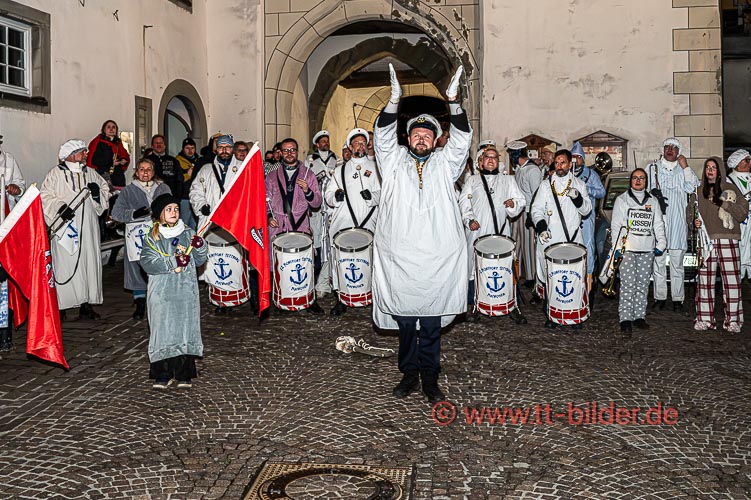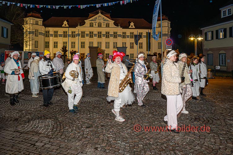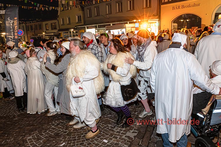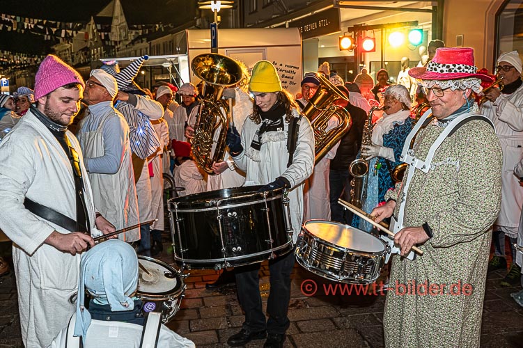 Der Hemedglonkerumzug am Sonntagabend – diesmal mit neuem Umzugsweg – war immer noch trocken. So konnten die Hemdglonker von der Storchenstraße über Karl- und Schlossstraße ziehen und den Abschluss mit Stadtkapelle und Fanfarenzug vor der Zunftstube feiern.