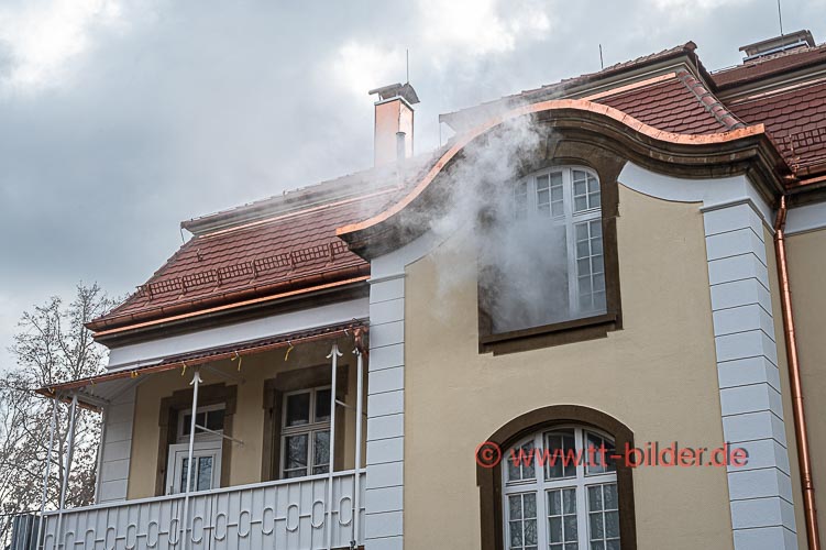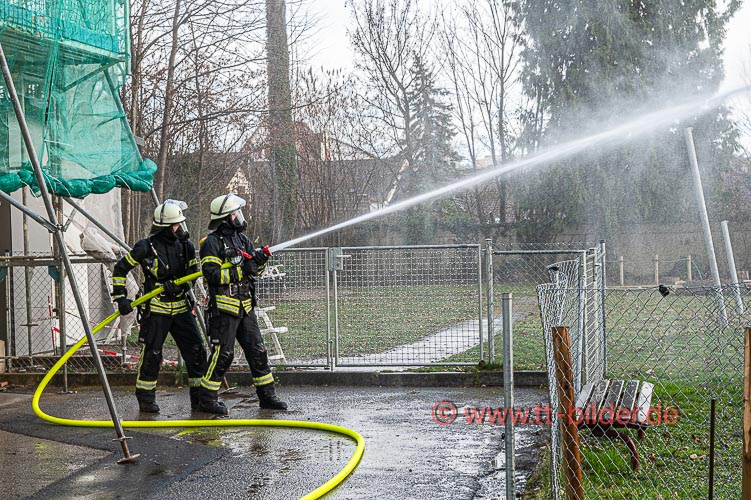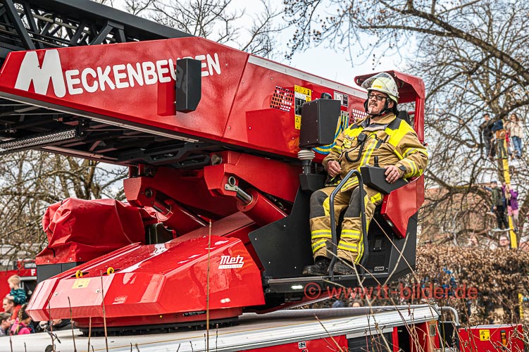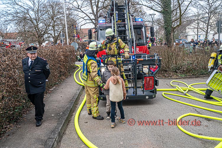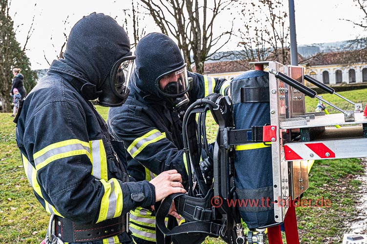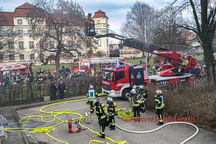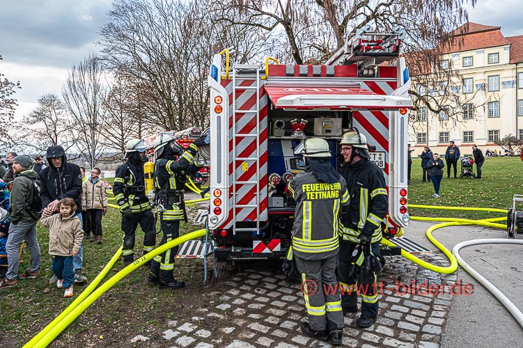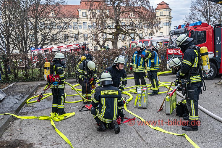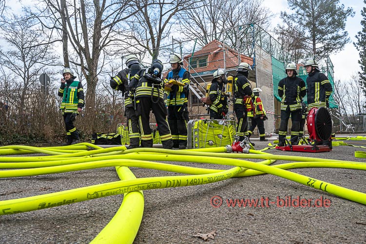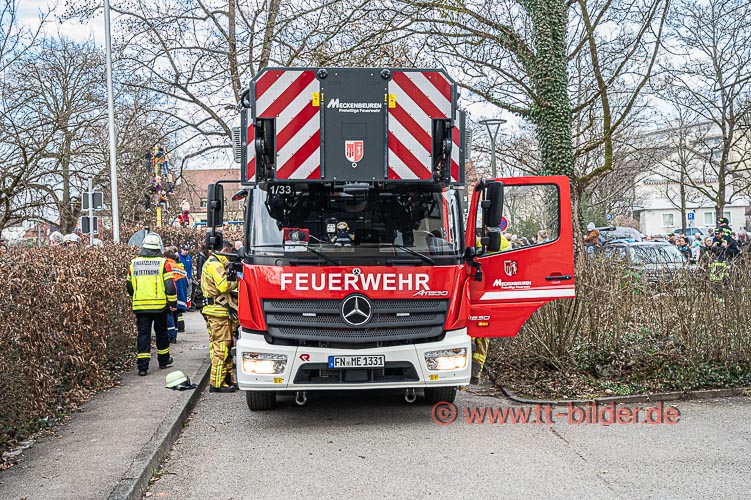 Und dann erfolgt die Alarmierung und nacheinander biegen die Feuerwehrfahrzeuge in die kleine Straße ein. Die Fahrzeuge mit den Gerätschaften und die Drehleiter von den Feuerwehr-Kollegen aus Meckenbeuren bauen sich im Schlosspark und vor dem Übungsobjekt auf – weitere Fahrzeuge platzieren sich weiter vorne am Kinderspielplatz.