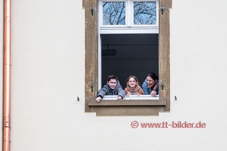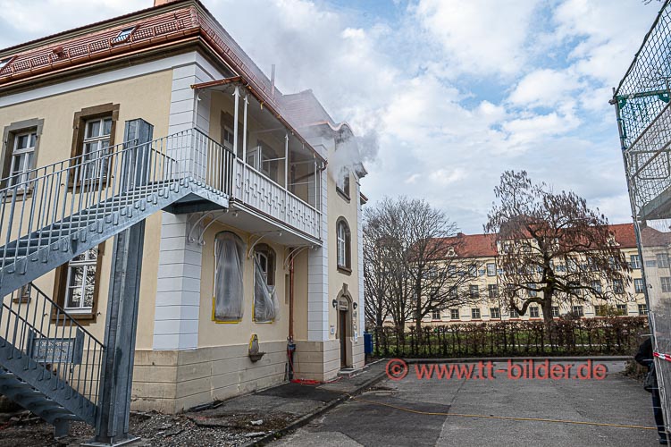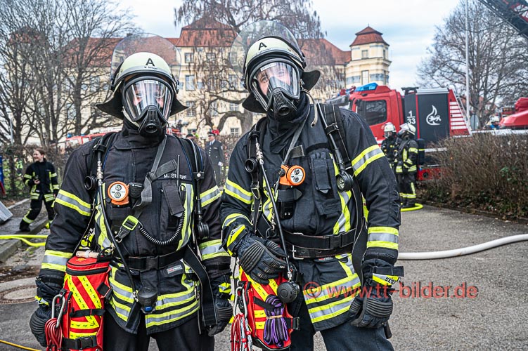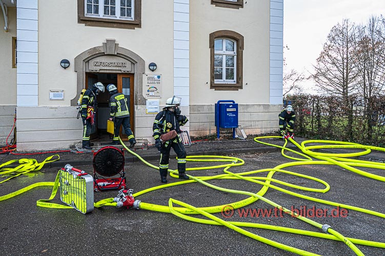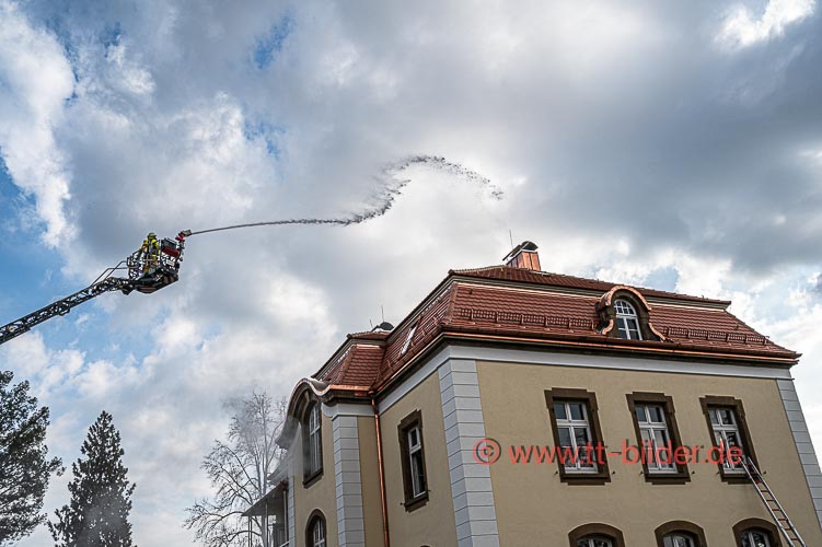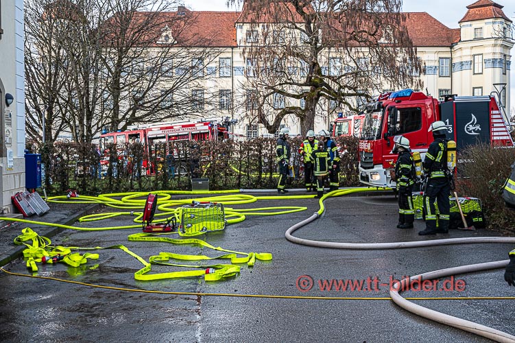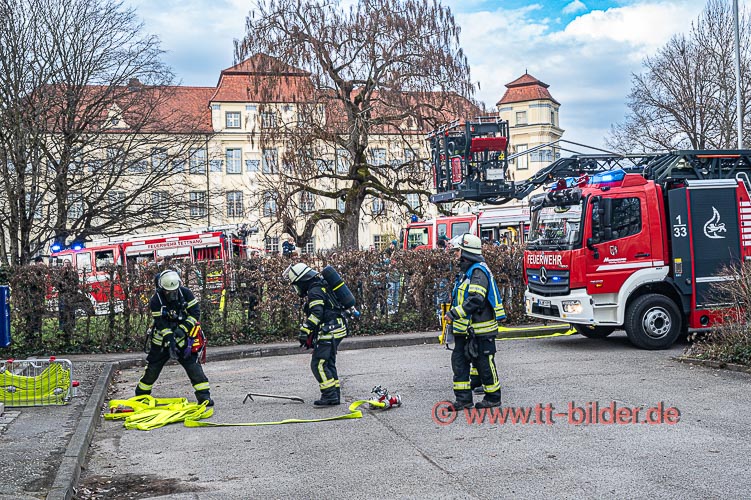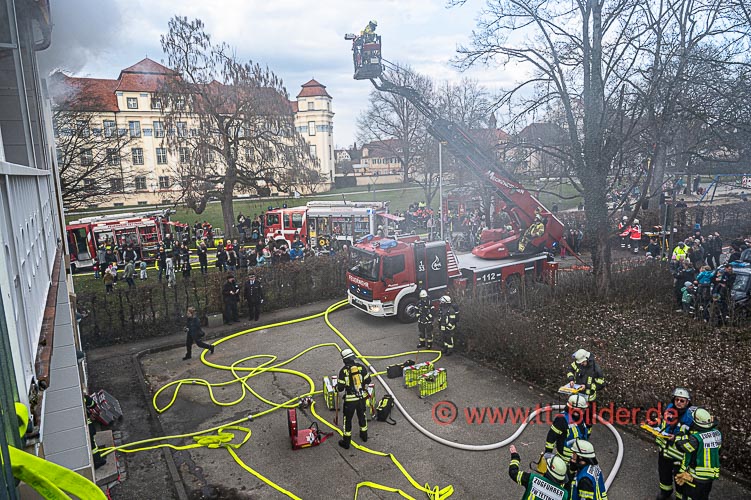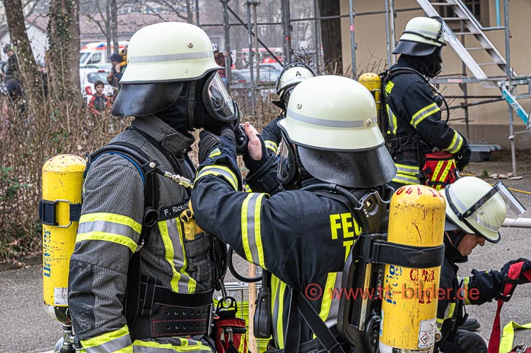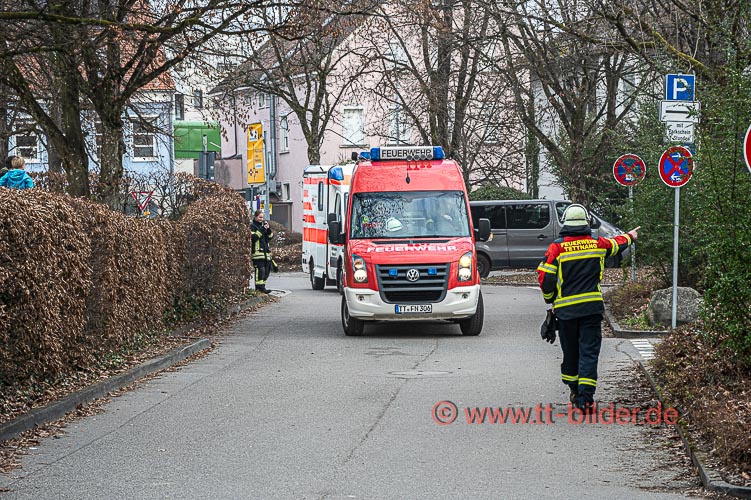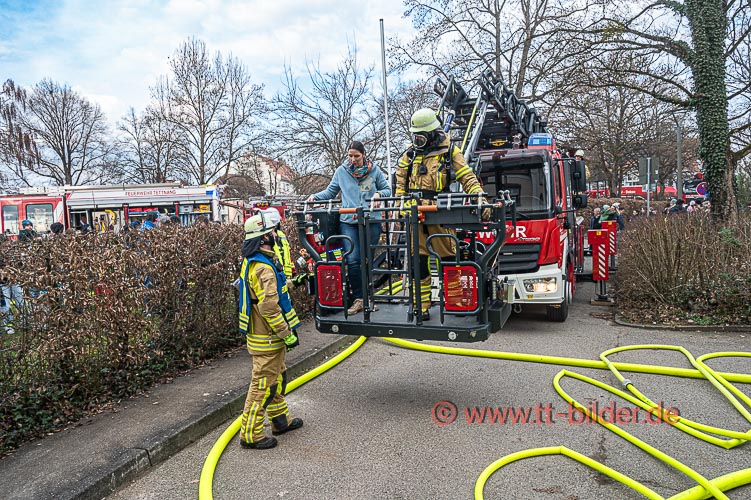 Und dann erfolgt die Alarmierung und nacheinander biegen die Feuerwehrfahrzeuge in die kleine Straße ein. Die Fahrzeuge mit den Gerätschaften und die Drehleiter von den Feuerwehr-Kollegen aus Meckenbeuren bauen sich im Schlosspark und vor dem Übungsobjekt auf – weitere Fahrzeuge platzieren sich weiter vorne am Kinderspielplatz.