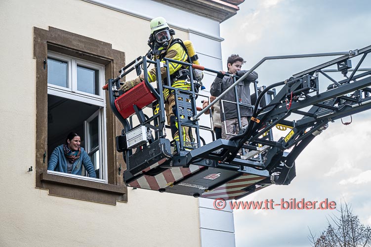 Übungsszenario ist die Annahme, dass Kinder und Betreuerinnen im 1. OG sind in dem ein Küchenbrand ausgebrochen ist. Eine Betreuerin und zwei Kinder müssen mit der Drehleiter gerettet werden – der Rest der Kinder mit Betreuerin kann sich über die Stahltreppe ins Freie retten.