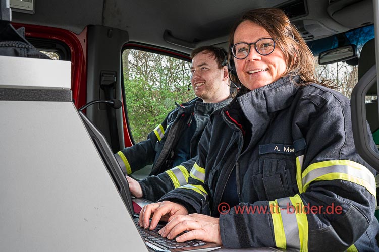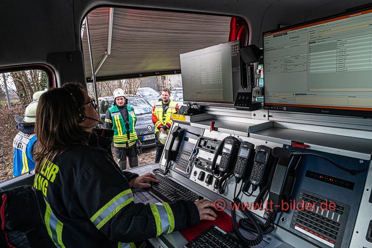 Etwas abseits auf dem Parkplatz steht ein Fahrzeug das als Kontrollzentrum fungiert. Hier hat sich auch die Führungsmannschaft der Übung versammelt. Hier laufen auch die Fäden des Einsatzes zusammen und werden protokolliert.