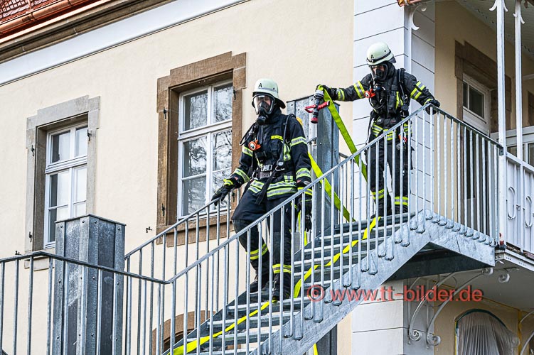 Trupps mit Atemschutz kontrollieren das Treppenhaus und dringen zum Brandherd vor.